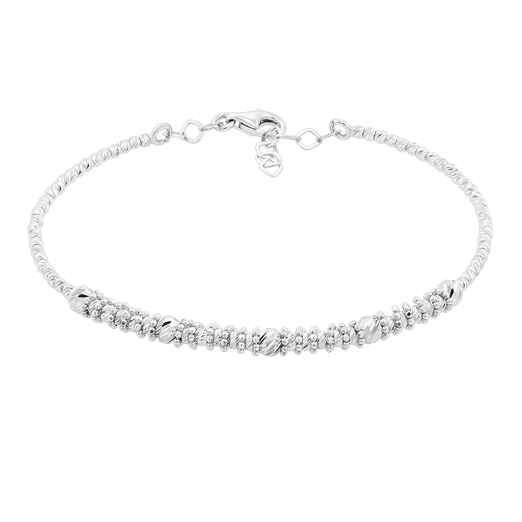 Браслет из белого золота 585 пробы - отличное украшение для себя и в подарок. Жесткий незамкнутый браслет выполнен из декоративных шариков с алмазной огранкой разного размера.