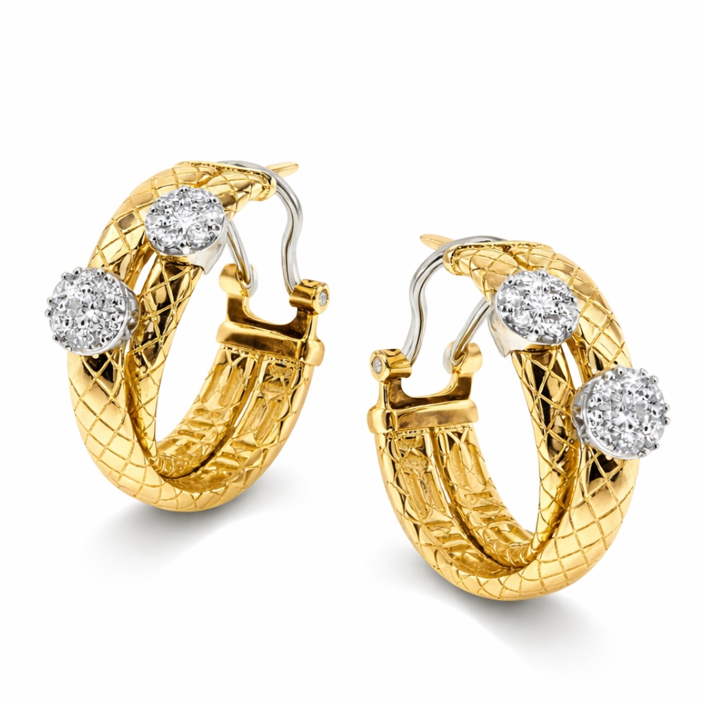 Серьги имеют двойное скрещенное полотно, создающее динамичную форму и объем. Замок «омега» обеспечивает надежную фиксацию и комфортную посадку, что особенно важно для ювелирных украшений премиального уровня.