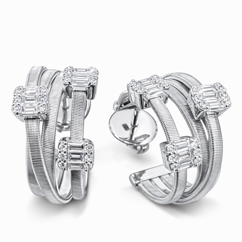 Дизайн выполнен в стиле итальянской ювелирной школы: поверхность украшения оформлена особой техникой обработки золота тонкой проволокой, обвивающей основу изделия. Такая технология создает эффект шелкового перелива и придает серьгам из золота 585 пробы уникальную текстуру и благородный блеск.