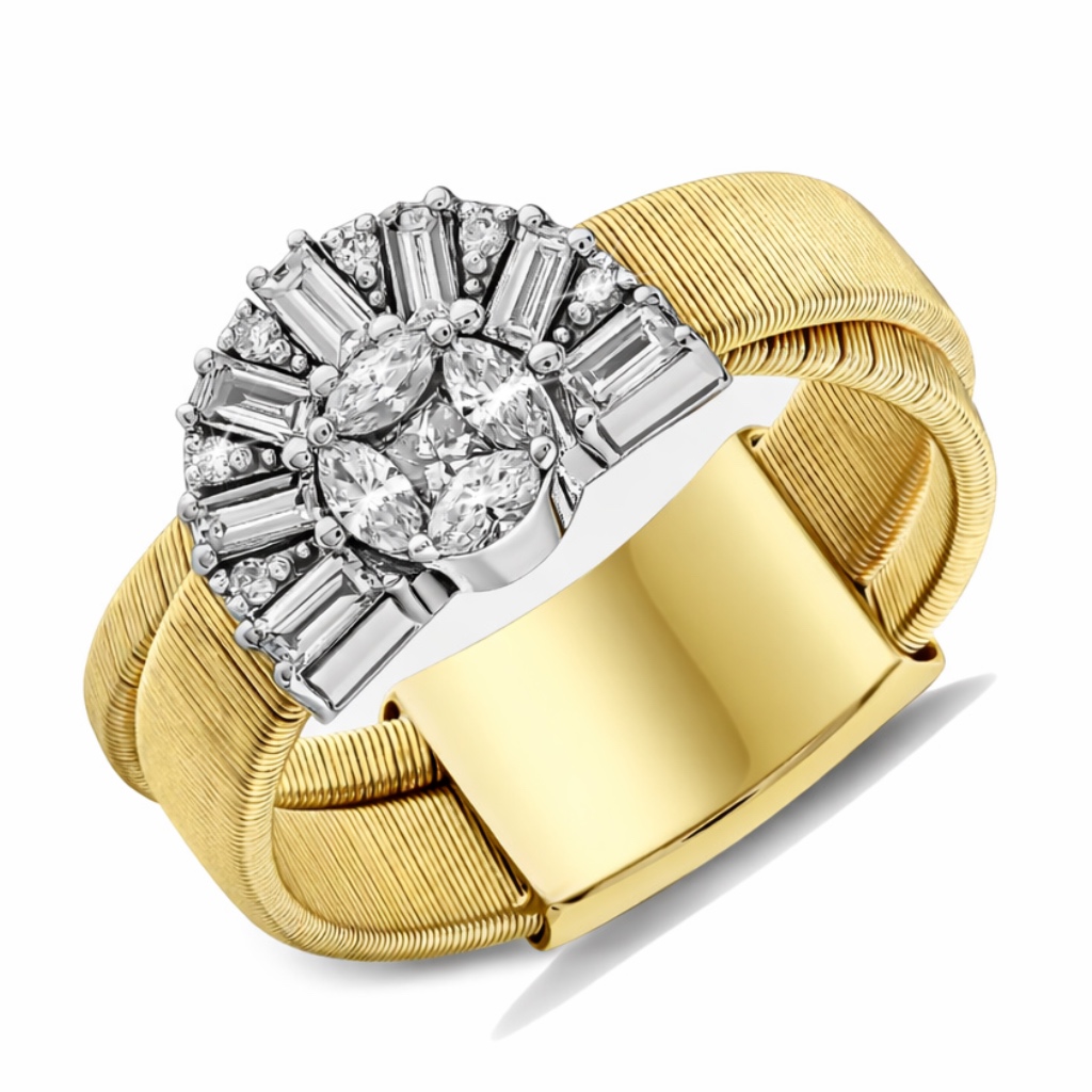 Кольцо из золота 585 пробы с бриллиантами подходит для торжественных мероприятий, свадьбы и праздничных событий. К модели можно подобрать серьги и браслет аналогичного дизайна, создав гармоничный ювелирный комплект Mostar Jewellery.