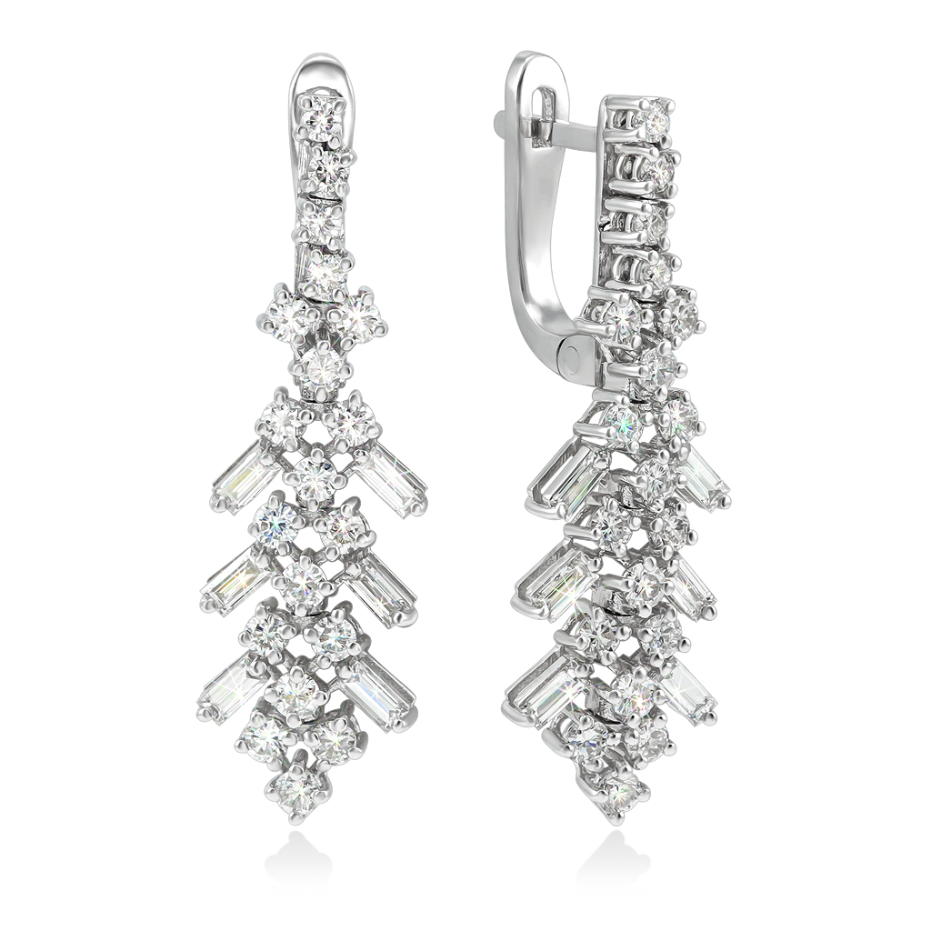 Великолепные нарядные серьги из белого золота с бриллиантами украсят Ваш праздничный образ и привлекут внимание окружающих. Серьги на английском замке с фигурным подвесным элементом щедро украшены бриллиантами разного размера круглой и багетной огранок.