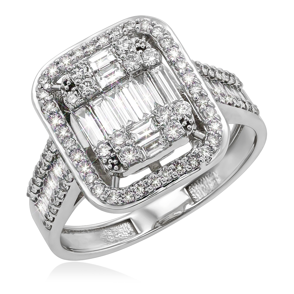 Кольцо с геометрической высокой площадкой в форме перстня богато украшено бриллиантами разного размера круглой и багетной огранки. Такое сочетание камней придает украшению свою неповторимую форму и особенный блеск. Широкая шинка с бриллиантами придает перстню свой шарм и по-королевски великолепный вид.