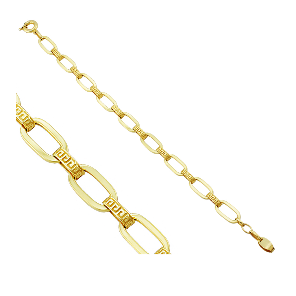 Браслет выполнен из золота 585 пробы. Двусторонний браслет якорного плетени с греческим орнаментомя, застежка (коробчатый замок) надежно фиксирует украшение на руке.