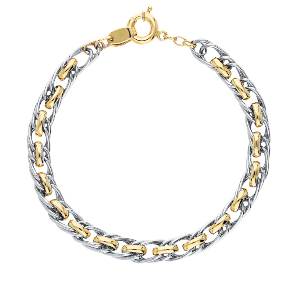 Браслет изготовлен из комбинированного белого и желтого золота 585 пробы. Декоративное фантазийное плетение выполнено с применением технологий облегчения за счет пустотелых звеньев.