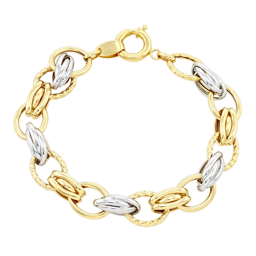 Плетение - комбинированное, выполнено с применением технологий облегчения за счет пустотелых звеньев разной формы и размеров. Частично звенья покрыты белым родием, это придает украшению больше яркости. Такой браслет смотрится объемно и при этом имеет небольшой вес.