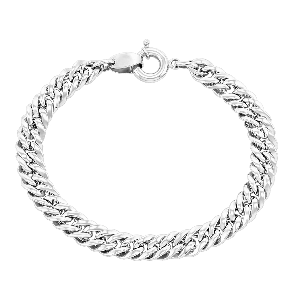 Звенья покрыты белым родием, это придает украшению больше яркости и блеска. Такой браслет смотрится объемно и при этом имеет небольшой вес.