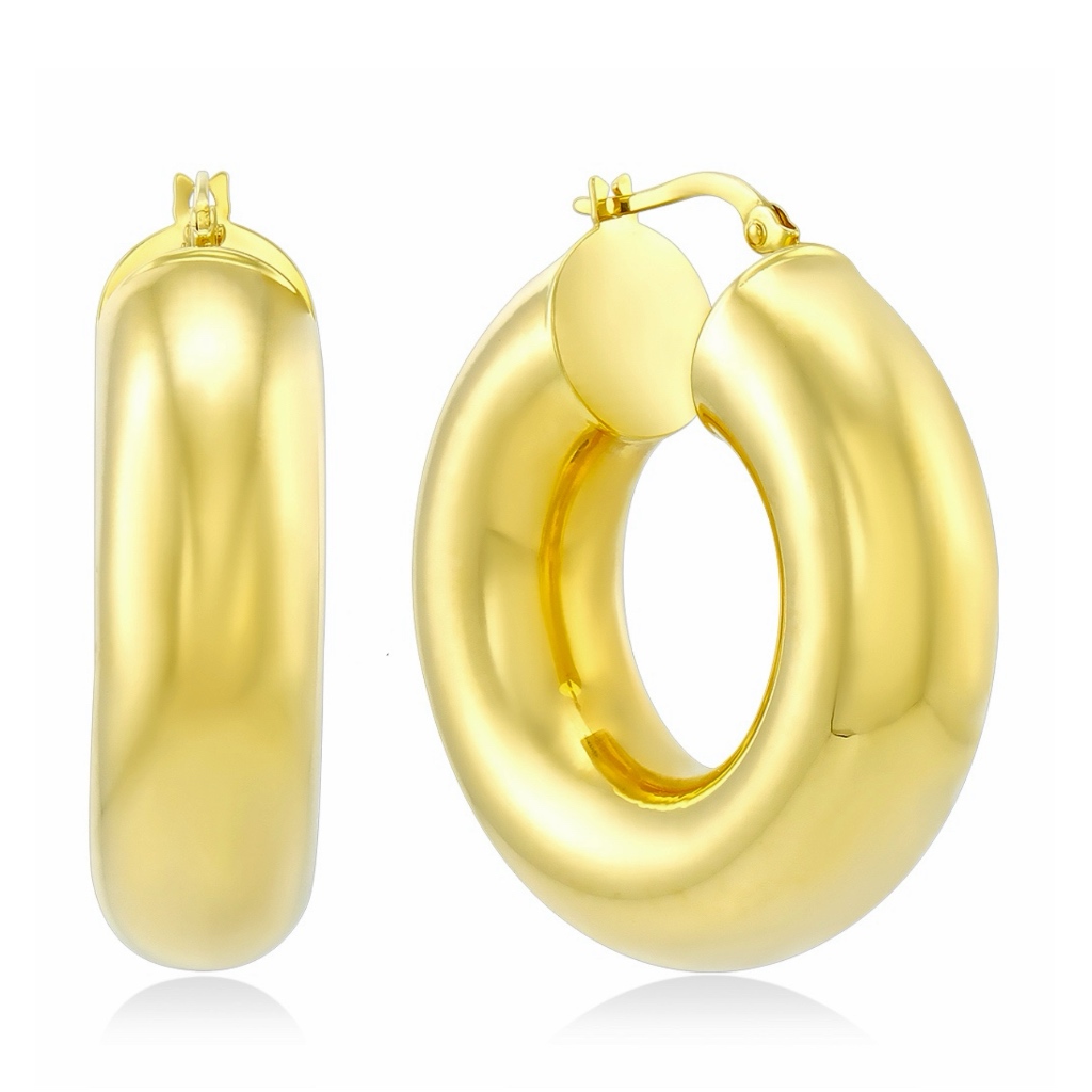 Серьги имеют объемную круглую форму и доступны в лимонно-желтом и белом цвете. Внутренний диаметр: 10 мм, наружный диаметр:26 см., толщина:10 мм., такие размеры делают серьги подходящими для повседневной носки и особых случаев.