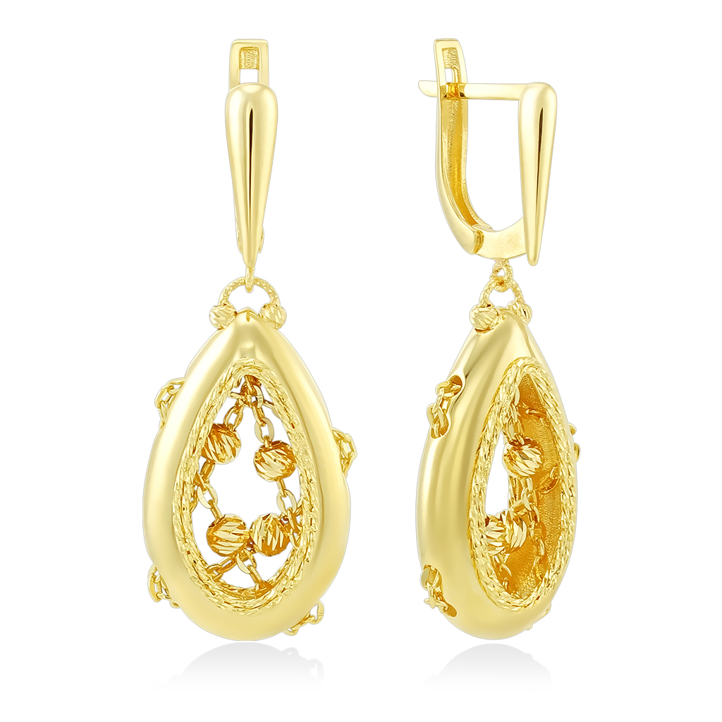 Итальянские серьги изготовлены из желтого золота 585 пробы. На гладком основании с английским замком подвижно закреплен объемный подвесной элемент в форме капли, внутри которого натянута цепочка с блестящими шариками. Серьги обработаны алмазной огранкой, они необычайно красиво сверкают и переливаются при ярком освещении, такое украшение как нельзя лучше подойдет для праздничного образа, для похода в театр, на концерт. Размер подвесного элемента составляет 26 х 18 мм, толщина 5 мм, длина основания 12 мм, рабочая зона штифта 9 мм. К серьгам можно подобрать подвеску и кольцо такой же модели.
