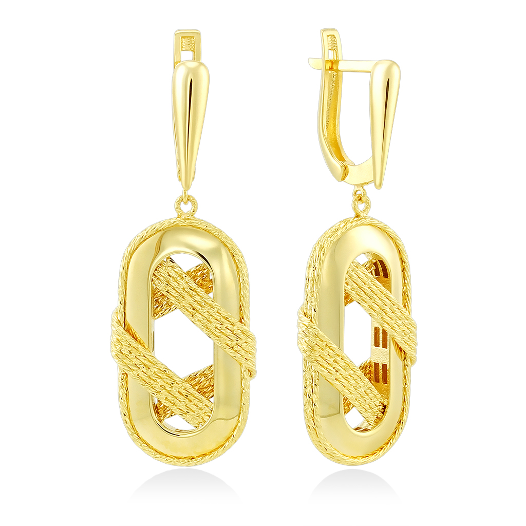 Серьги изготовлены из желтого золота 585 пробы. На гладком основании декоративный подвесной элемент овальной формы.