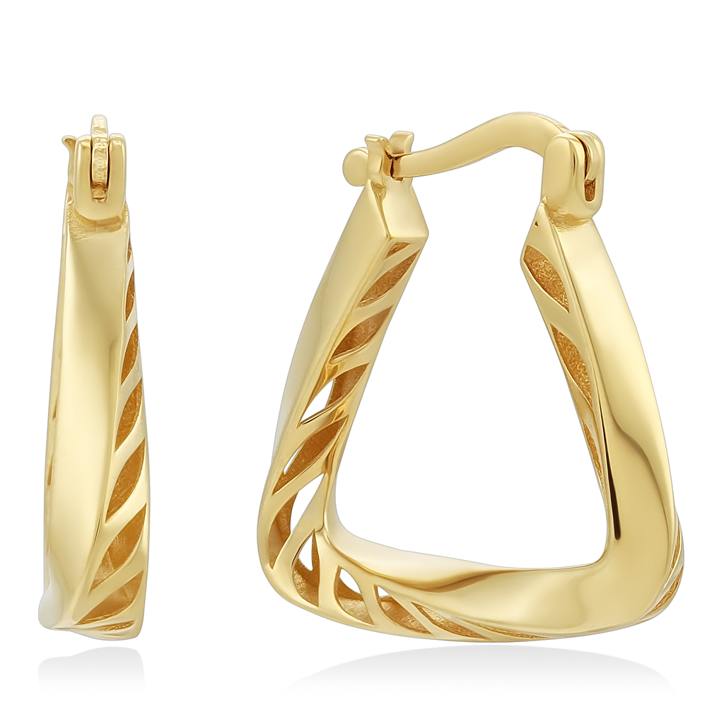 Женские серьги конго из золота 585 пробы. Стильные дизайнерские серёжки имеют трапецевидную форму, что выделяет их из многообразия конго, а также эффектно дополнят нарядный, вечерний и праздничный образ. Полотно серьги состоит из гладкой поверхности и тонкой сеточки, которое эффектно закручено вокруг своей оси. Сетка обегчает украшение, делает почти невесомым и комфортным для носки. Размеры серьги: по верхней замковой стороне 10 мм, по трем остальным сторнам 20 мм.