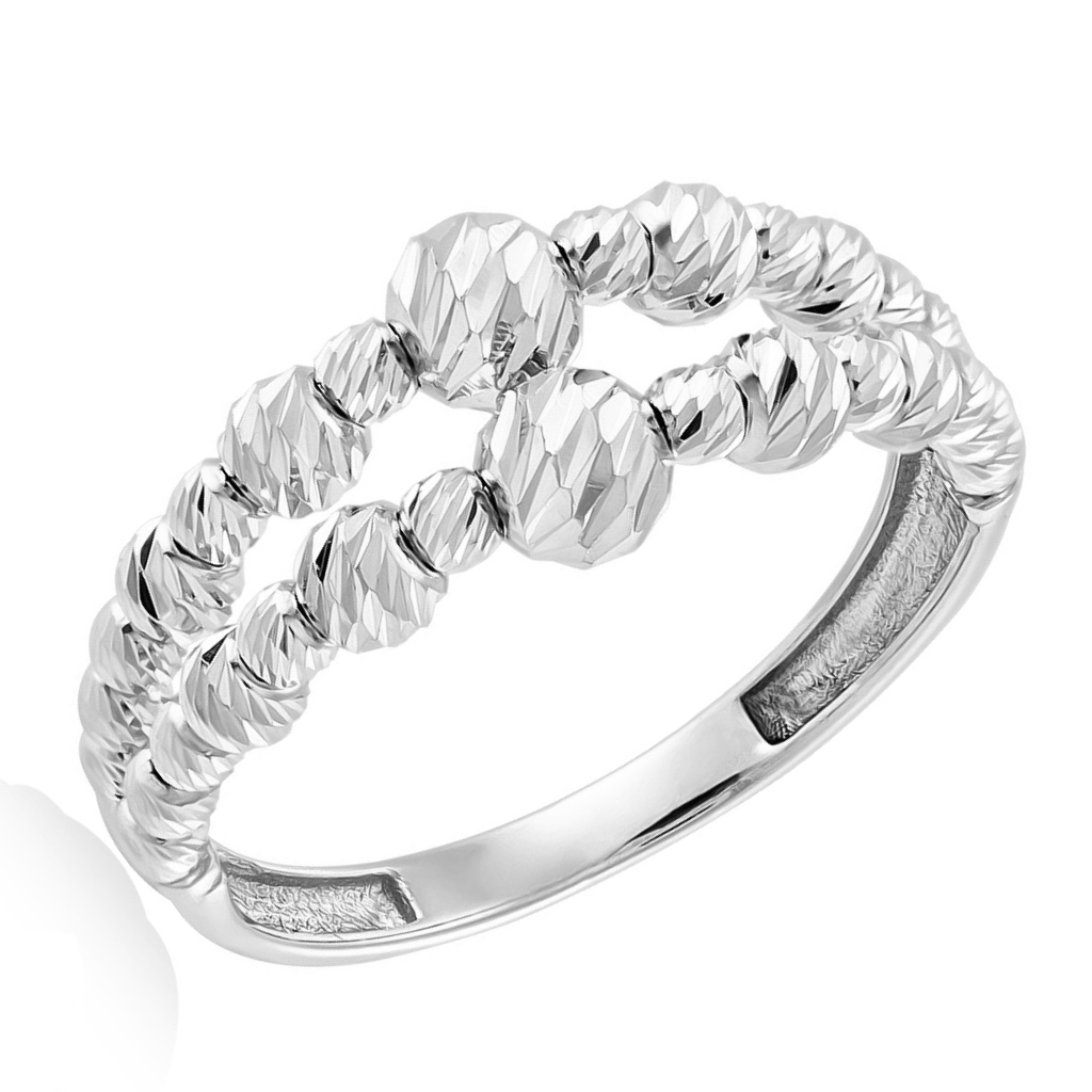 Верхняя часть шинки образовани двойной дорожкой из шариков разного размера. Они обработаны алмазной огранкой, которая придает яркий искрящийся блеск. Шарики неподвижно закреплены на проволоке, поэтому кольцо держит форму и не гнется.