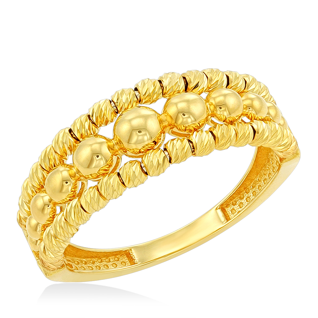 Кольцо выполнено из желтого золота 585 пробы. Верхняя часть кольца образована тройной дорожкой из шариков разного размера.