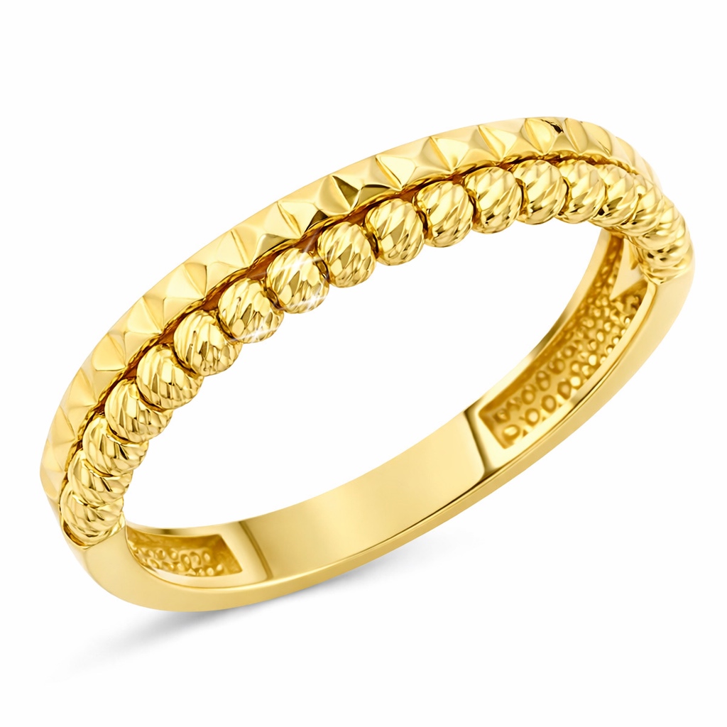 Кольцо изготовлено из желтого золота 585 пробы в форме двойной дорожки, одна из которых состоит из шариков, другая из пирамидок. Шарики обработаны алмазной огранкой, что придает им вид блестящих камней. Такое кольцо прекрасно подойдет для повседневной носки и праздничного образа. Стильное и нежное украшение подчеркнет ваш вкус и индивидуальность или может стать прекрасным подарком. Ширина шинки составляет 2-4 мм.