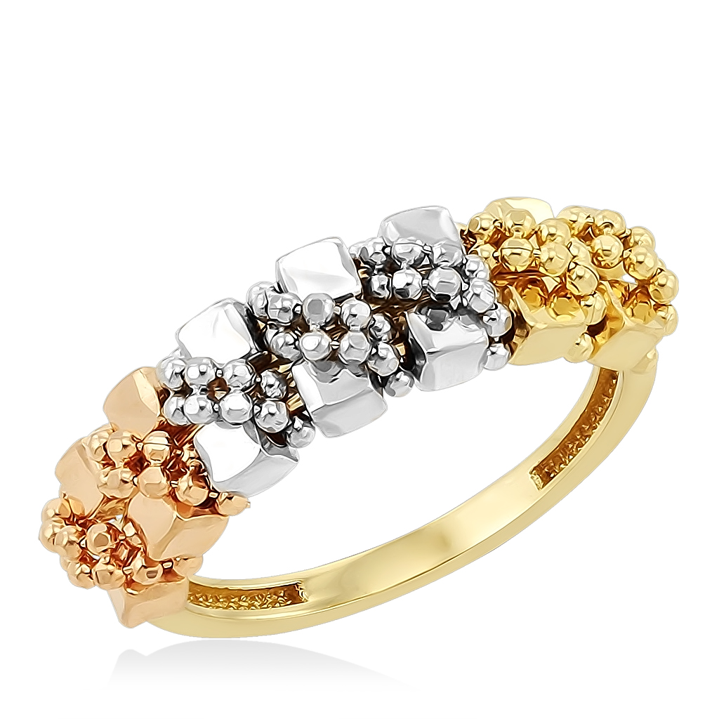 Кольцо выполнено из комбинированного золота 585 пробы. Стильное минималистичное украшение, состоит из маленьких золотых шариков, что создает объемную фактуру и придает дополнительный блеск. Стильное и нежное украшение подчеркнет ваш вкус и индивидуальность. В пару к кольцу рекомендуем приобрести гарнитур подвеску и серьги.