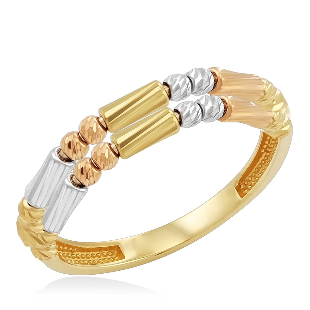 Кольцо выполнено из золота 585 пробы. Украшение состоит из золотых шариков и трубочек с алмазной огранкой, что создает объемную фактуру и придает дополнительный блеск. Ширина верхней части кольца 3,5 мм.