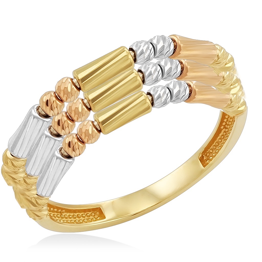 Кольцо выполнено из комбинированного трехцветного золота 585 пробы.