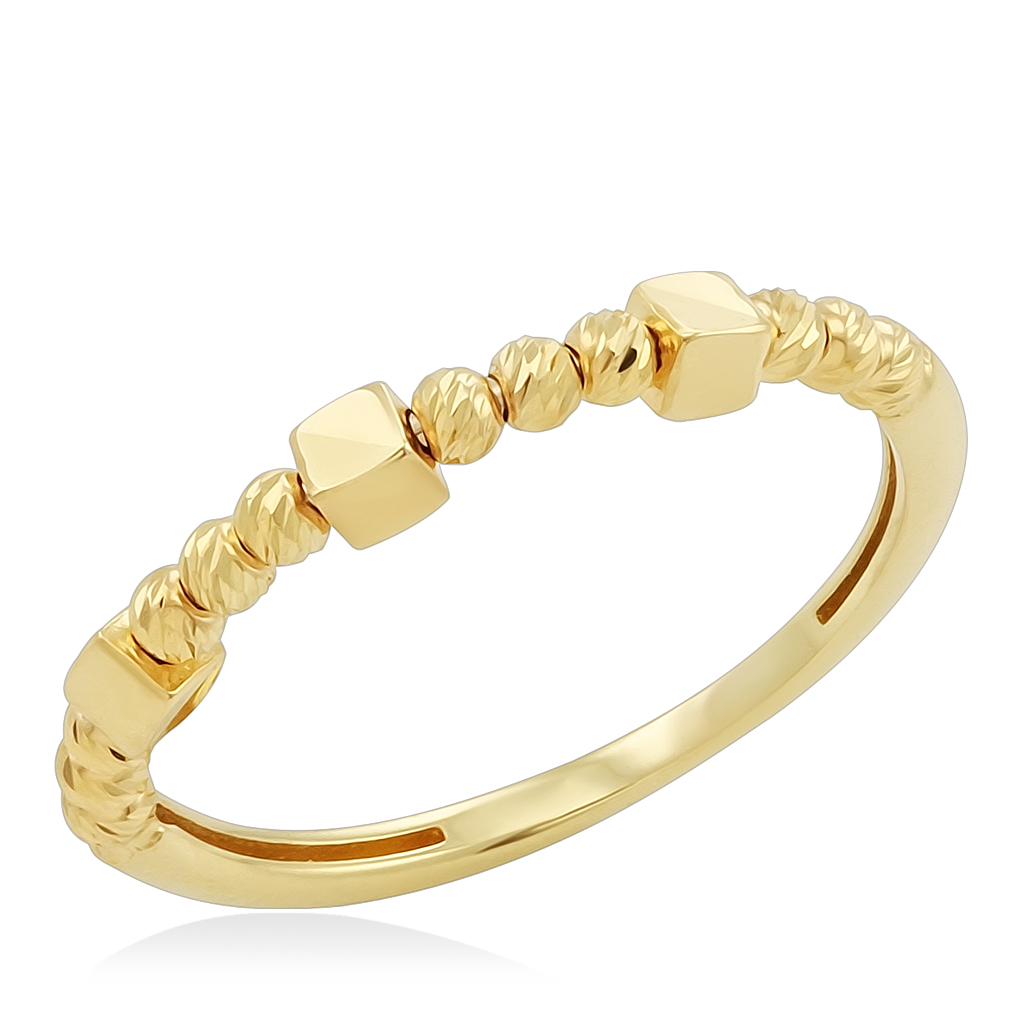 Украшение состоит из золотых шариков и кубиков , что создает объемную фактуру и придает дополнительный блеск. Дизайнерское женское кольцо из желтого золота 585 пробы украсит ваш повседневный и праздничный образ.