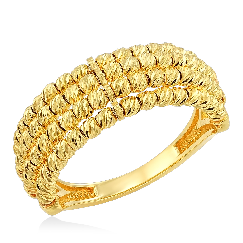 Кольцо выполнено из комбинированного золота и состоит из золотых шариков с алмазной огранкой, что создает объемную фактуру и придает необычный искрящийся блеск.
